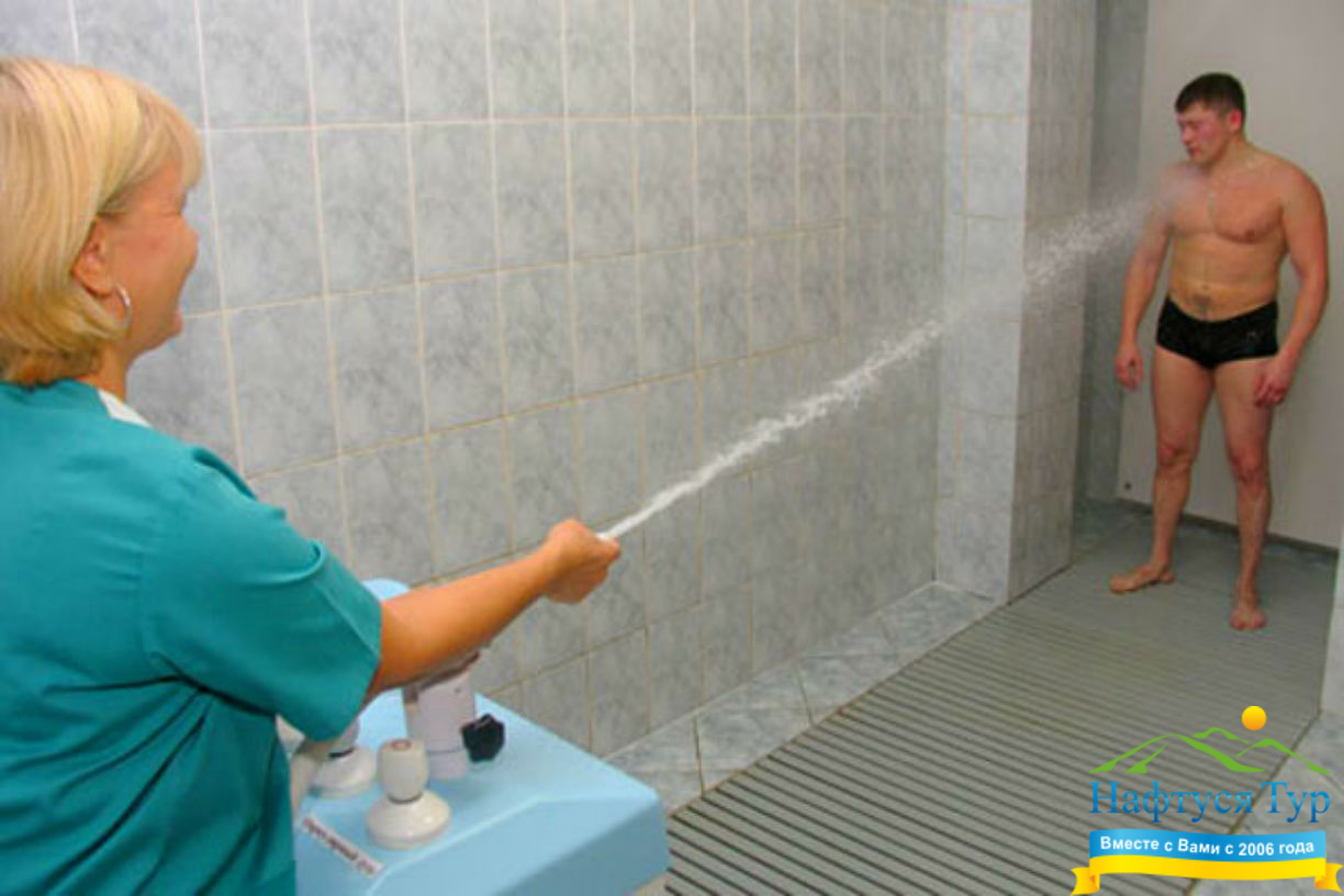 В большинстве санаториев нашей страны имеется оборудование для лечения с использованием душа Шарко. В ходе процедуры диапазон температур воды обычно составляет +20-40 градусов, при этом может использоваться как обычная (водопроводная), так и минеральная вода. Длительность каждого сеанса составляет 1-10 минут (первые сеансы короче), курс может включать до 20 сеансов. Основными показаниями для применения душа Шарко являются: нормализация работы нервной системы, борьба с проблемами опорно-двигательного аппарата, целлюлитом, ожирением.